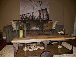 Beautiful and sturdy! : This table is better than I expected. Some parts are solid wood, others are covered with a distressed veneer. It is very convincing looking, and looks much more expensive than it was. The top is a faux concrete look MDF that is seriously heavy. It went together easily and it's very sturdy feeling. It was delivered in good condition via FedEx, without issue, and in under a week. I'm glad I took a chance without seeing any customer pictures, but I've included some of mine to help other customers decide.