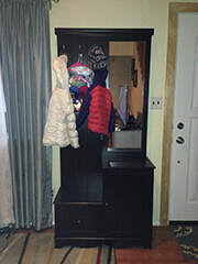 Cappuccino Tree Hall : Really love this tree hall. Perfect size fit what we needed. Fits right next to our font door. It's a dark espresso color and quality is really good. It has a pull out drawer and a cabinet with shelving. It's a perfect spot for shoes, hats, misc things. Love the mirror and space for sitting. Overall a great buy and thus site had the best price. Shipping and delivery was great too.